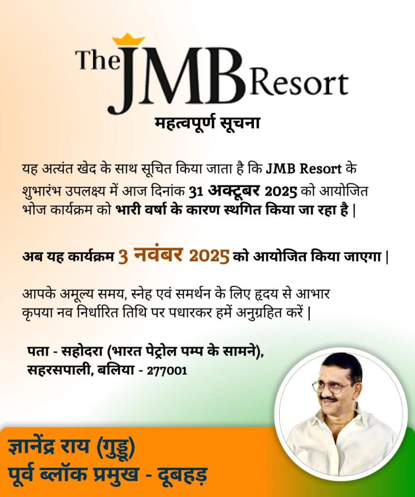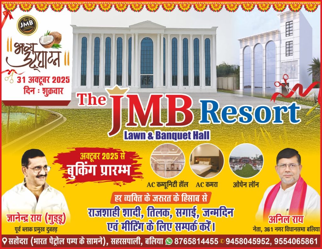 बलिया नगर विधानसभा क्षेत्र के वरिष्ठ नेता अनिल राय और पूर्व ब्लाक प्रमुख ज्ञानेंद्र राय गुड्डू का यह व्यवसायिक प्रतिष्ठान बलिया में आयोजित होने वाले शुभ मूहूर्तों का यह एक बेहतरीन स्थान होगा। JMB RESORT वर्तमान समय के अनुसार आधुनिक सुविधाओं से लैस एक अनूठा स्थान है जहां सभी बेहतरीन सुविधाएं प्रदान की जाएंगी। प्रतिष्ठान के भव्य उद्घाटन की तैयारी की गई है। JMB RESORT की बुकिंग भी प्रारंभ है। उद्घाटन समारोह और उद्घाटन भोज अब पूर्व निर्धारित तिथि 31 अक्टूबर की जगह तीन नवंबर को होगा। तिथि परिवर्तन भारी बारिश के कारण की गई है। पूर्व ब्लाक प्रमुख ज्ञानेंद्र राय गुड्डू ने लोगों से तीन नवंबर को उद्घाटन समारोह भोज में सहभागिता कर आशीर्वाद देने की अपील की है।