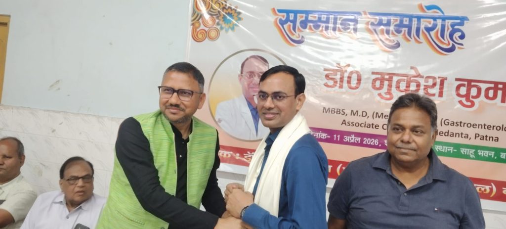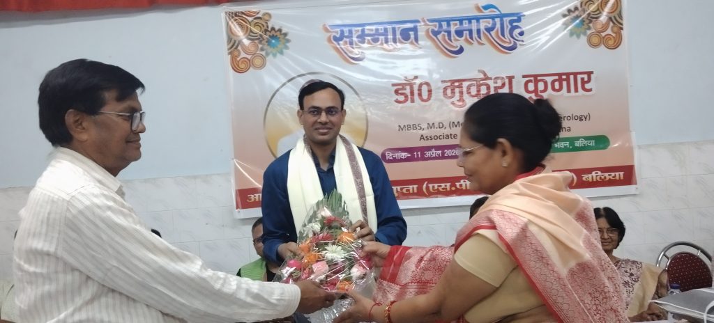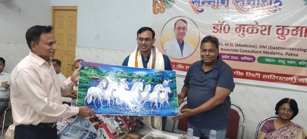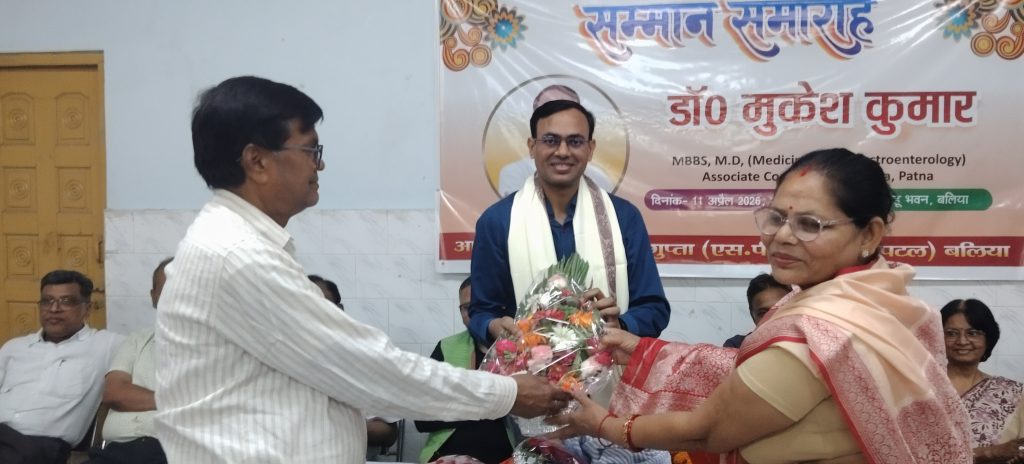 बलिया। नगर के जापलिनगंज स्थित साहू भवन के सभागार में शनिवार की शाम को पटना मेदांता के गैस्ट्रो चिकित्सक डॉ. मुकेश कुमार का सम्मान समारोह आयोजित किया गया। जिसमें बलिया को और अधिक सुविधाजनक चिकित्सा प्रदान करने पर बल दिया गया। इस मौके जिले लोगों ने डॉ. मुकेश कुमार का भव्य सम्मान किया।