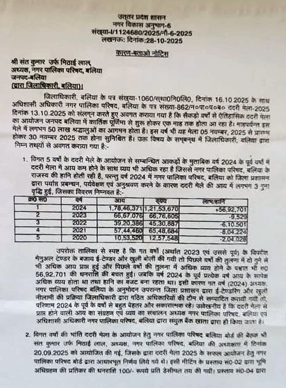 जिलाधिकारी, बलिया के पत्र संख्या-1060/स्था०नि०ति०, दिनांक 16.10.2025 द्वारा उपलब्ध करायी गयी आख्यानुसार संत कुमार उर्फ मिठाई लाल, अध्यक्ष, नगर पालिका परिषद-बलिया, द्वारा ददरी मेले से सम्बन्धित भूमि अधिग्रहण एवं आयोजन सम्बन्धी कार्यवाही में उच्चादेशों की अवहेलना की गयी है, जिसमें अपने पदीय दायित्वों का समुचित रूप से निर्वहन न करने एवं प्राप्त अधिकारों का दुरूपयोग किये जाने का प्रथम दृष्टया दोषी पाये जाने पर शासन के पत्र संख्या- 1/1124680/2025/नौ-6-2025, दिनांक- 28.10.2025 द्वारा संत कुमार उर्फ मिठाई लाल, अध्यक्ष, नगर पालिका परिषद-बलिया, जनपद-बलिया को इस आशय का कारण बताओ नोटिस निर्गत किया गया है कि उनकी वित्तीय और प्रशासनिक शक्तियों, कृत्यों और कर्तव्यों का प्रयोग, निष्पादन और निर्वहन करने से तब तक के लिये प्रविरत (Cease) क्यों न किया जाये जब तक कि उन्हें कारण बताओ नोटिस में उल्लिखित आरोपों से मुक्त न कर दिया जाये।